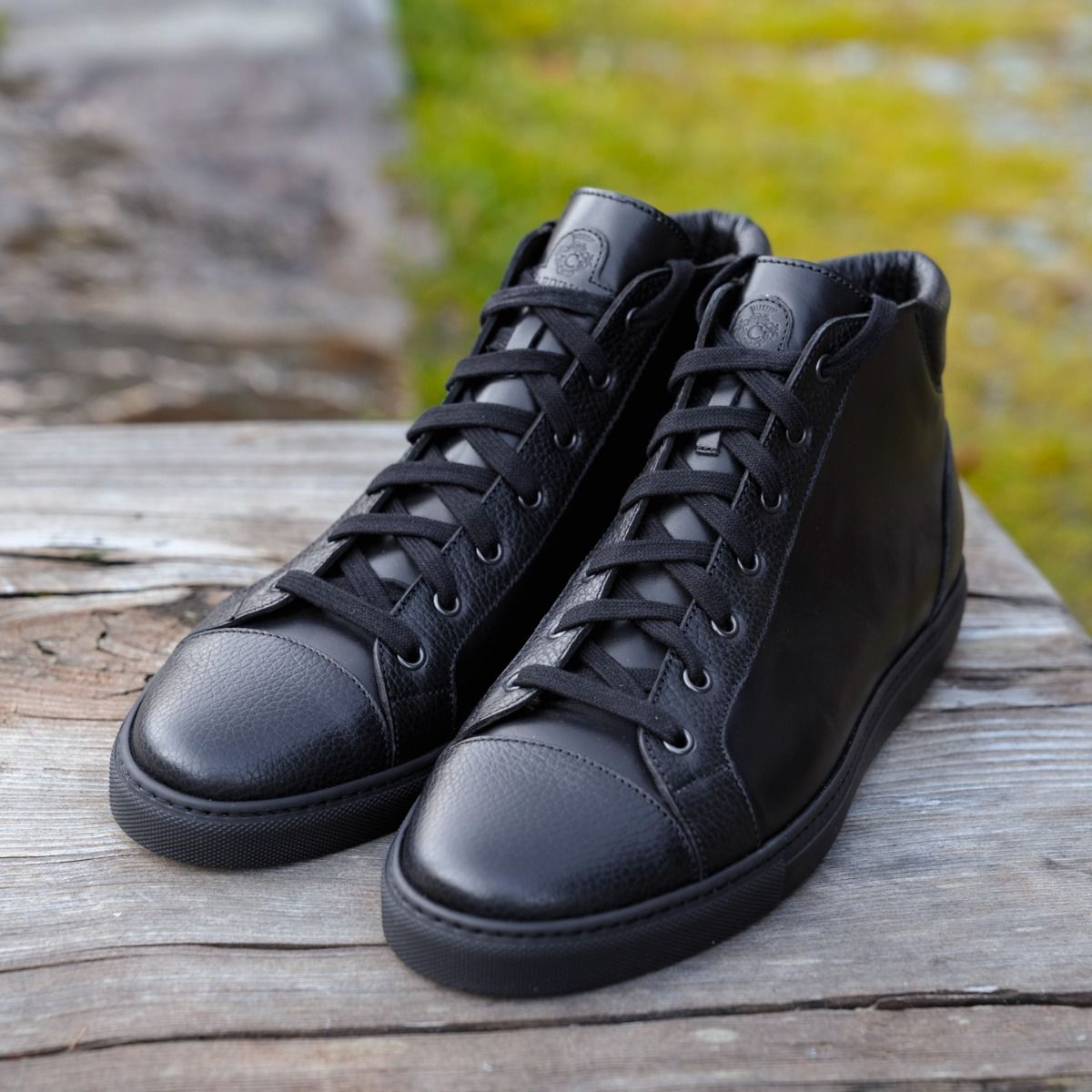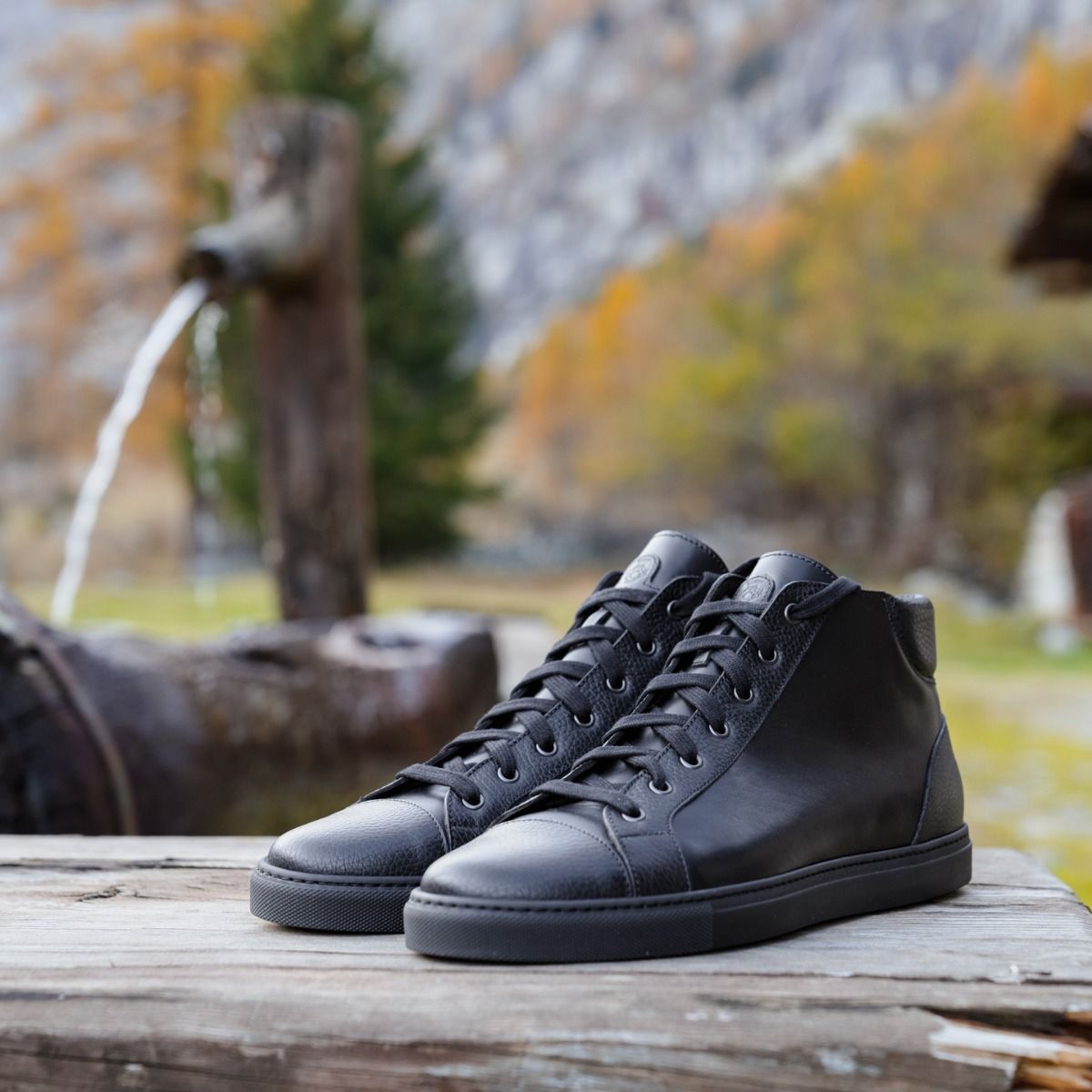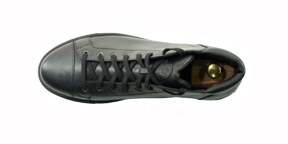 Cardinale's Exclusive sneakers Collection. Material: full grain calfskin and grained calfskin. Colour: black. Outsole: black rubber. Use: leisure time. These casual yet elegant sneakers are perfect with a pair of jeans for an elegant casual look. Dress them up with a suit for a business casual style. Available in a large range of colours and materials. Made in Italy from premium materials, these sneakers are very comfortable and finished with elegant details.