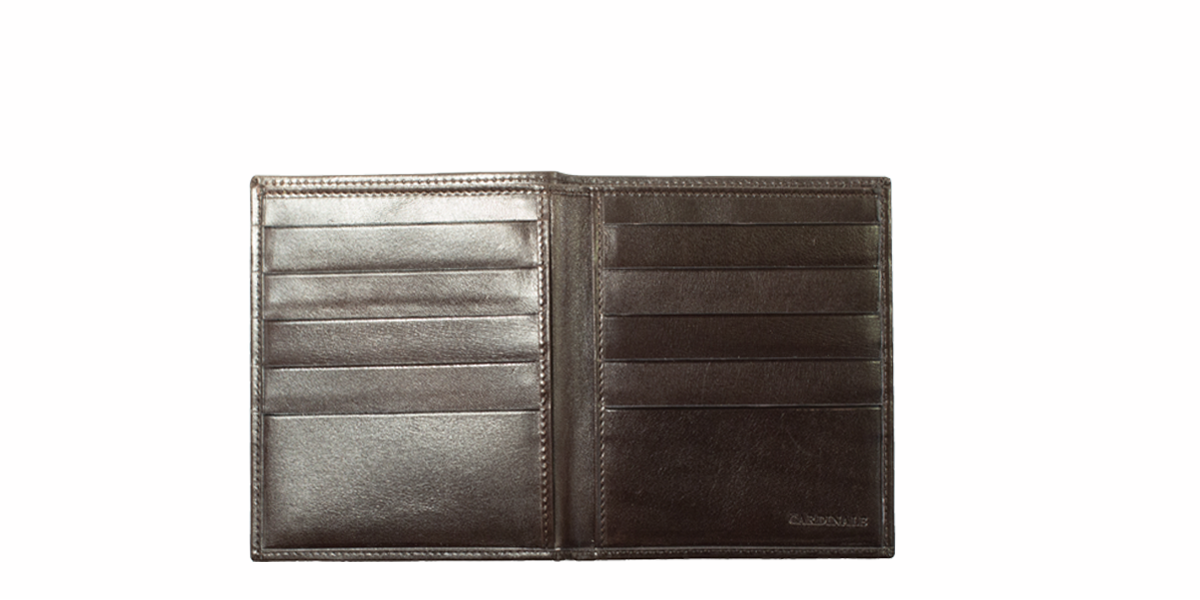 Cardinale exclusive Milan collection wallet. 10 card slots, 1 note compartment, 2 extra pockets. Material: full grain calfskin. Colour: dark brown. Embossed Cardinale logo on the front. Dimensions: 12,5x 10,5. Made in Italy. It is made of the same leather used for our shoes. An elegant men's wallet that has room for a lot of cards and documents in credid card size.