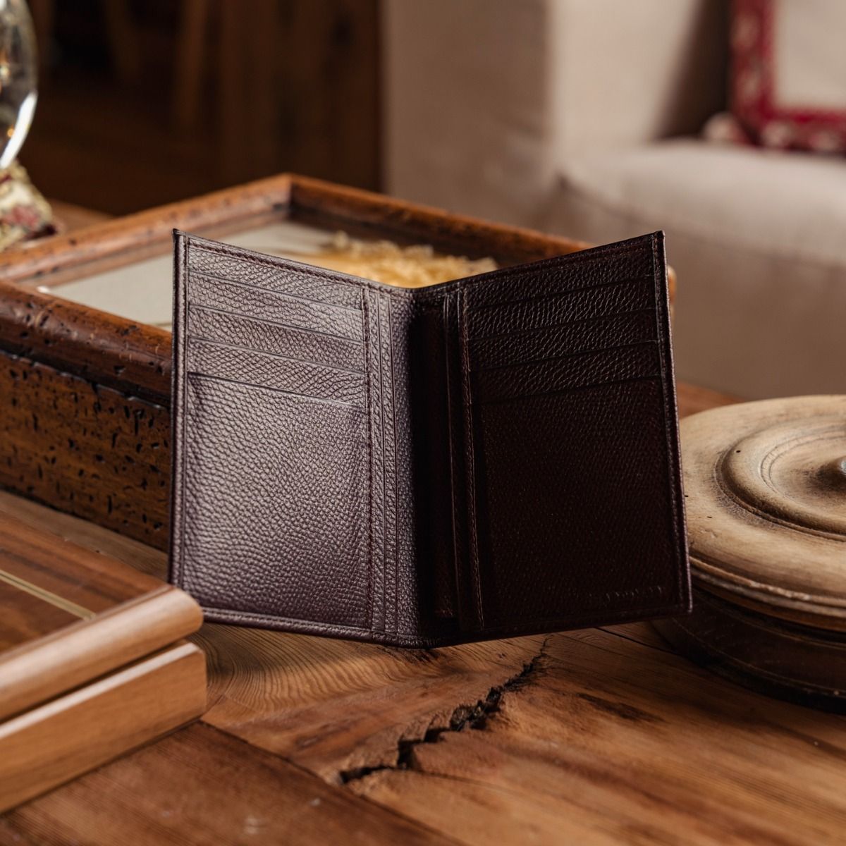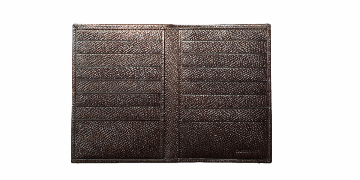 Cardinale exclusive Geneve collection wallet. 14 card slots, 1 note and passport compartment, 2 extra pockets. Material: grained calfskin. Colour: dark brown. Dimensions: 10,5x 15. Made in Italy. Handcrafted from the same leather used for our shoes. An elegant men's wallet that has room for a lot of cards and for a passport.