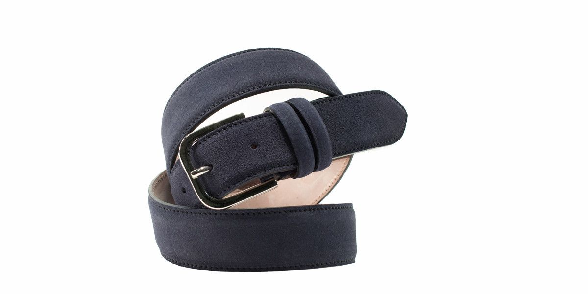 A Cardinale's exclusive leather belt. It's made of English crust leather and it's entirely hand-sewn. Silver rounded buckle. Colour: blue. Lining colour: beige. Height: 33 mm. Handcrafted from the same leather used for our shoes. It is ideal both for leisure and work.