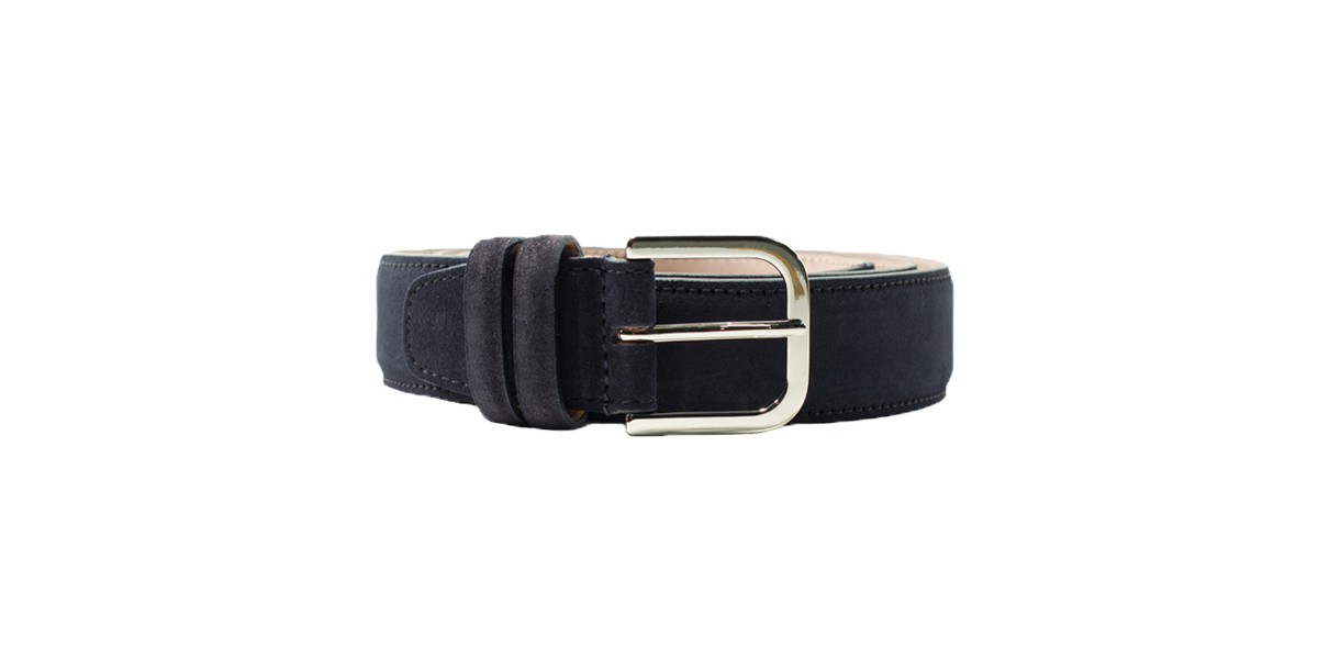 A Cardinale's exclusive leather belt. It's made of reversed leather and it's entirely hand-sewn. Silver rounded buckle. Colour: blue. Lining colour: beige. Height: 33 mm. Handcrafted from the same leather used for our shoes. It is ideal both for leisure and work.