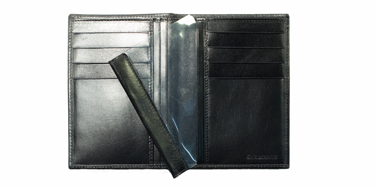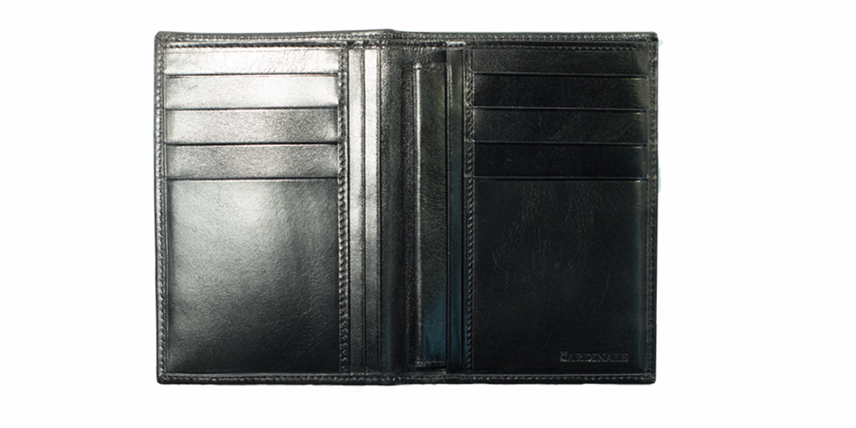 As part of the Cardinale Exclusive Paris Collection, this wallet offers 8 card slots, 1 note compartment, 5 extra pockets, 1 document compartment. Embossed Cardinale logo on the front. Material: full-grain calfskin. Colour: black. Dimensions: 9 x 12,8. Made in Italy. Handcrafted from the same leather used for our shoes. A well-organized wallet ideal for paper documents.