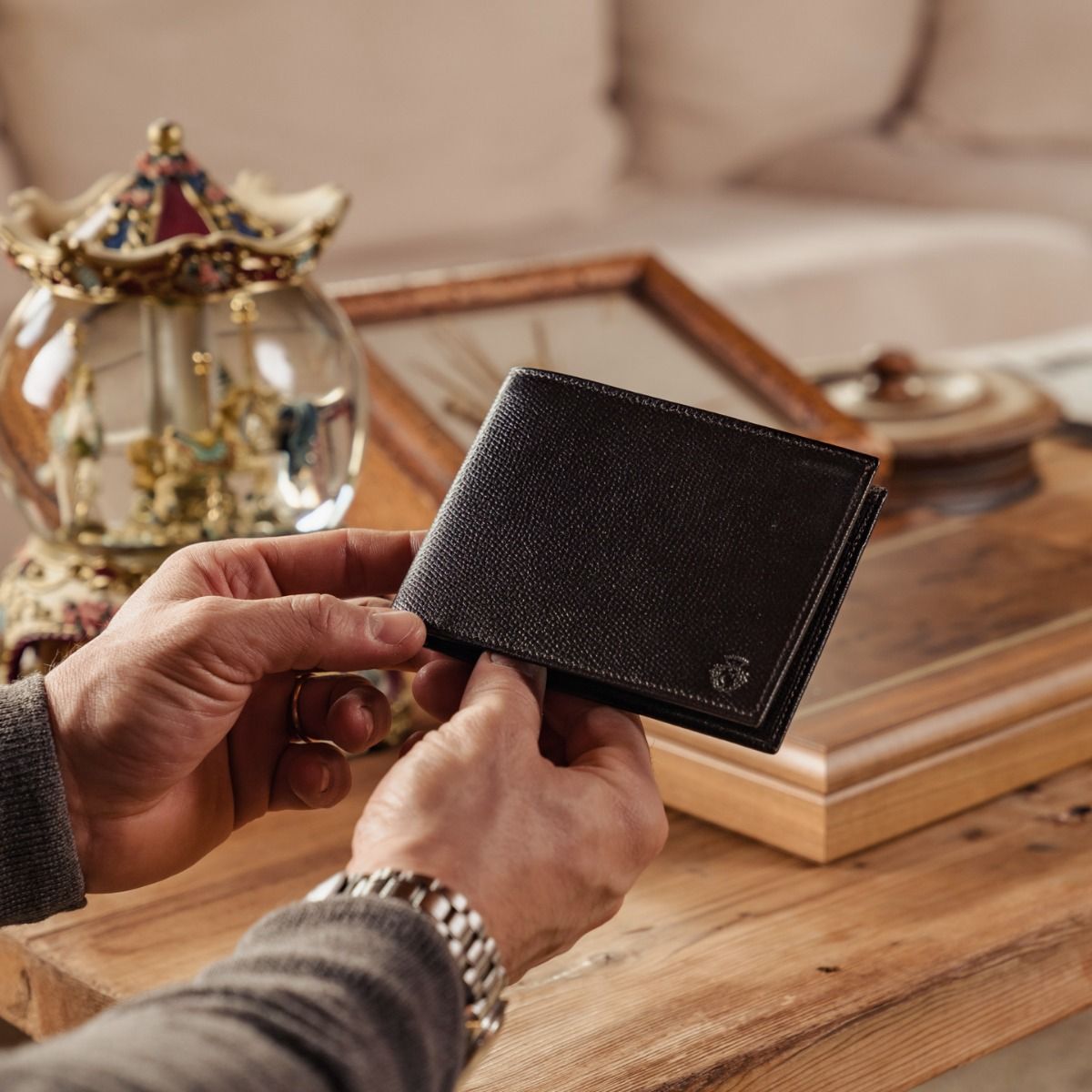 As part of the Cardinale Exclusive Royal collection, this wallet offers 8 card slots, 2 full-length note compartments, 4 extra pockets. Material: grained calfskin. Colour: dark brown. Dimensions: 12,5x 9,5. Made in Italy. It is made of the same leather used for our shoes. A great classic men's wallet.