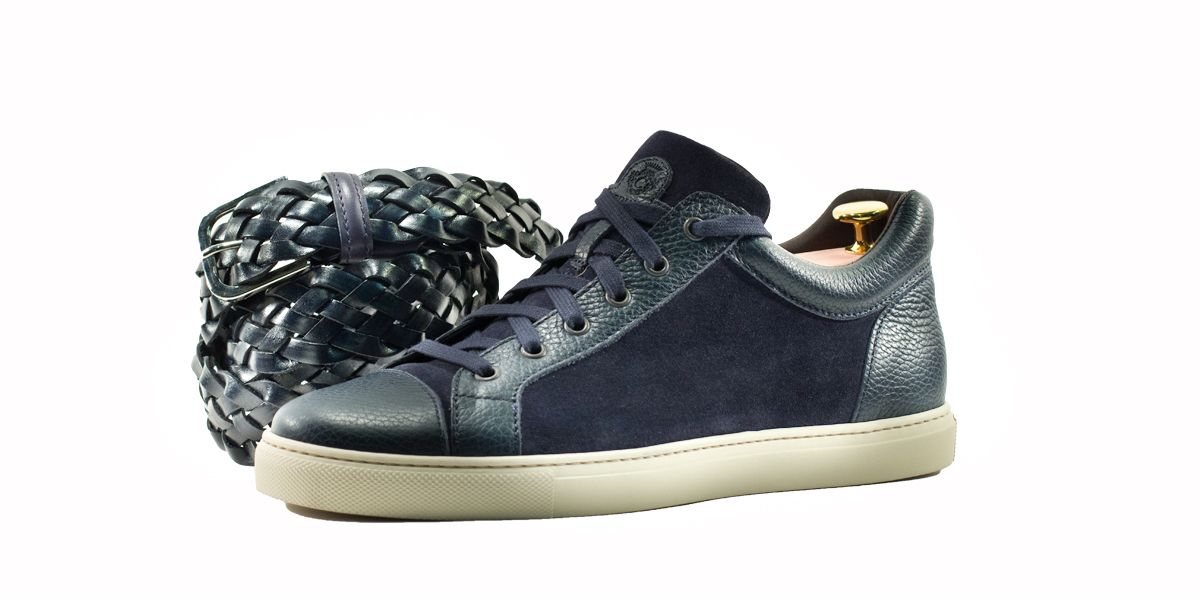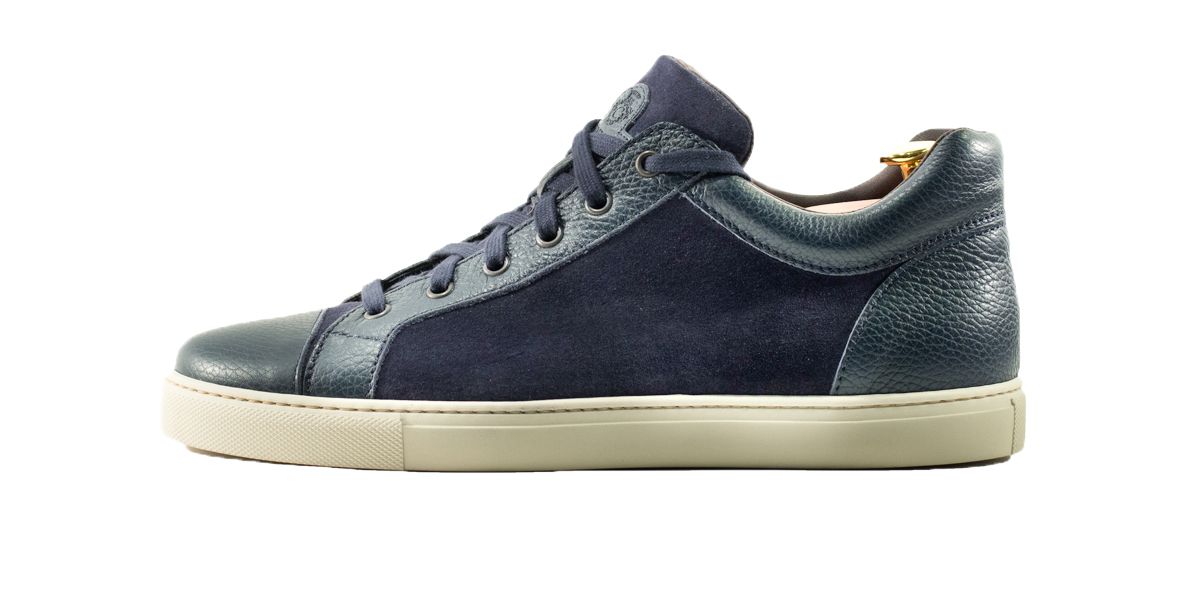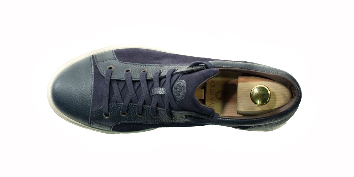 Sneakers esclusiva di Cardinale in camoscio con inserti in pelle. Pellame: crosta e Vitello pieno fiore. Colore: blu. Fondo: gomma nero. Utilizzo: tempo libero. La collezione nuova di sneakers di Cardinale vuole soddisfare un cliente che ama essere sportivo ma al tempo ad tesso formale. Questa collezione infatti può essere abbinata ad un jeans o ad uno spezzato il venerdì , ormai chiamato casual-friday. E' incredibilmente confortevole e ed proposta in numerosissime varianti di colori, pellami e fondi. Curatissima nei dettagli e nelle scelte dei materiali utilizzati, con una produzione esclusivamente made in Italy.