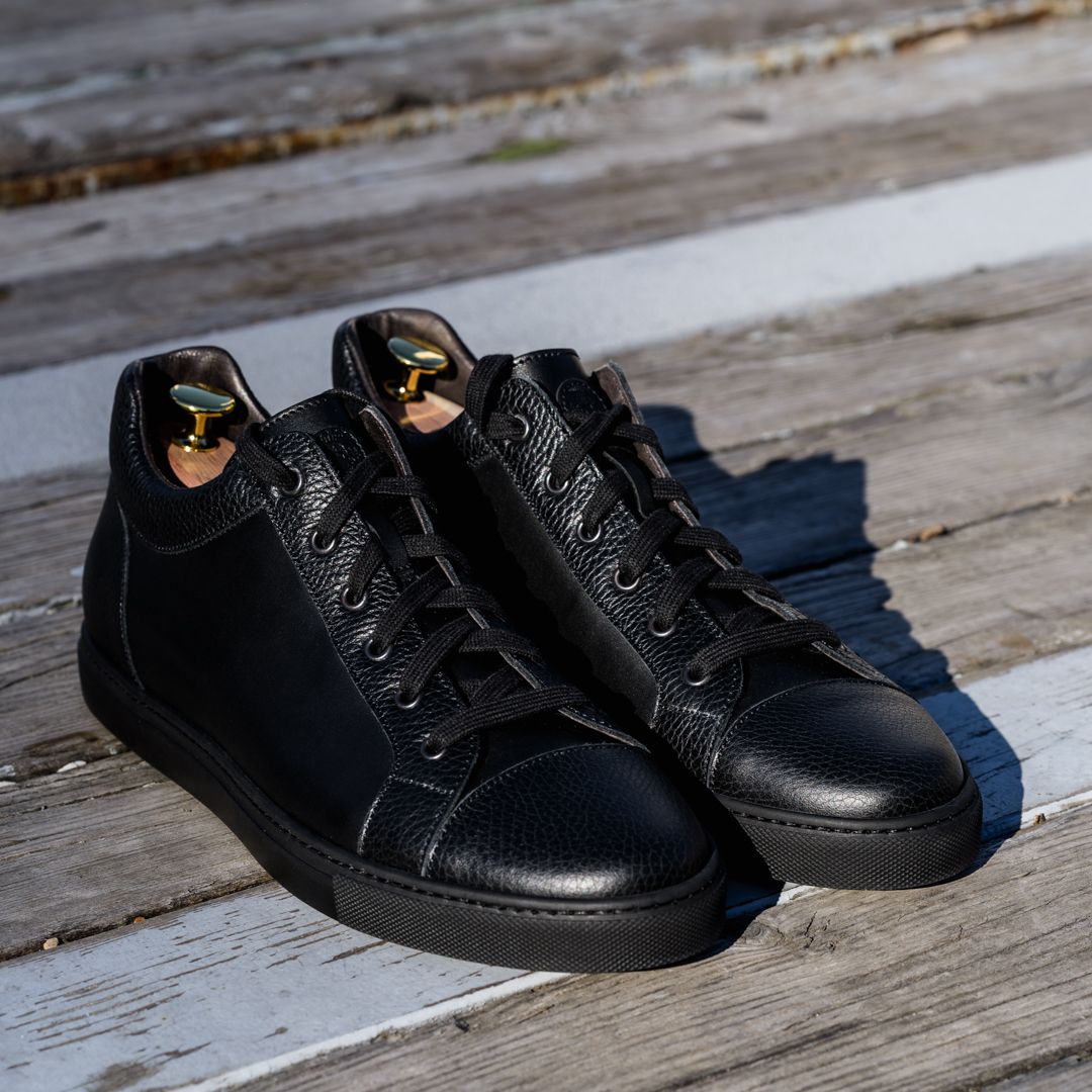Sneakers esclusiva di Cardinale in camoscio con inserti in pelle. Pellame: crosta e Vitello pieno fiore. Colore: blu. Fondo: gomma nero. Utilizzo: tempo libero. La collezione nuova di sneakers di Cardinale vuole soddisfare un cliente che ama essere sportivo ma al tempo ad tesso formale. Questa collezione infatti può essere abbinata ad un jeans o ad uno spezzato il venerdì , ormai chiamato casual-friday. E' incredibilmente confortevole e ed proposta in numerosissime varianti di colori, pellami e fondi. Curatissima nei dettagli e nelle scelte dei materiali utilizzati, con una produzione esclusivamente made in Italy.