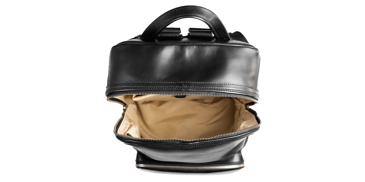 Zaino cucito a mano e a macchina , con più di 30 passaggi che prevedono il taglio, la scarnitura,la rifinitura della pelle, la cucitura, la lucidatura, la tintura dei bordi a cera, etc. Prodotto interamente in Italia. |
