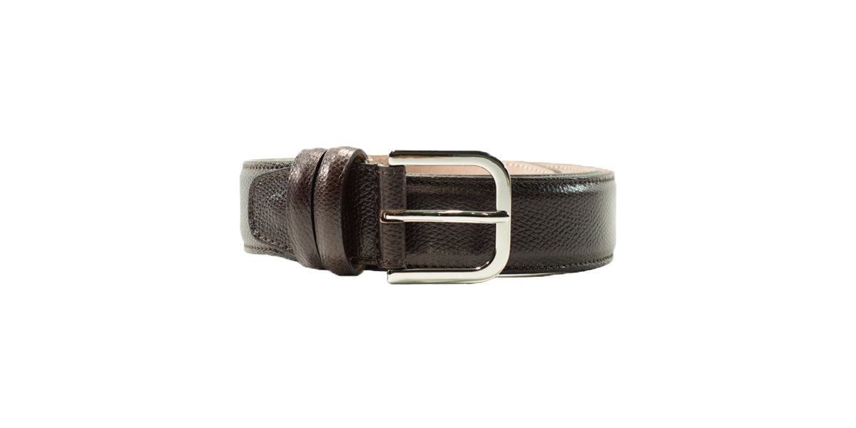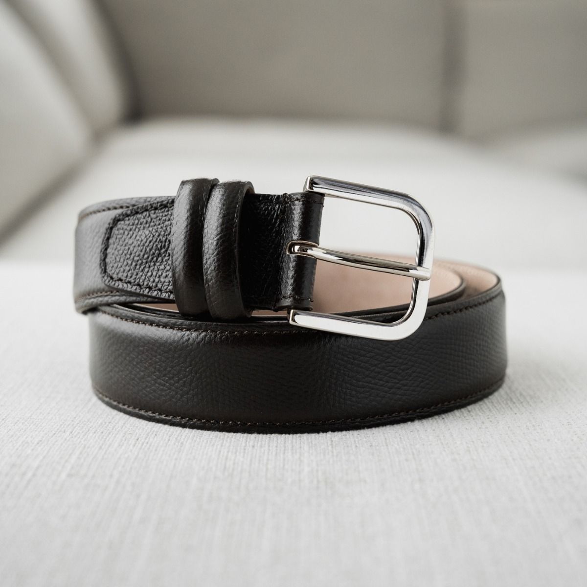 Cintura esclusiva di cardinale interamente cucita. Realizzata in vitello martellato pieno fiore color testa di moro con fibbia stondata colore argento. Colore cintura: testa di moro. Fodera: beige. Altezza: 33 mm. Cintura realizzata con gli stessi pellami delle scarpe. Ideale sia per lavorare che per il tempo libero libero.