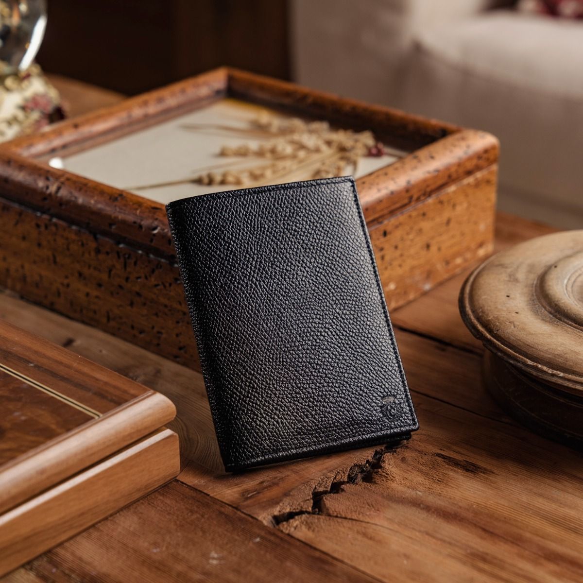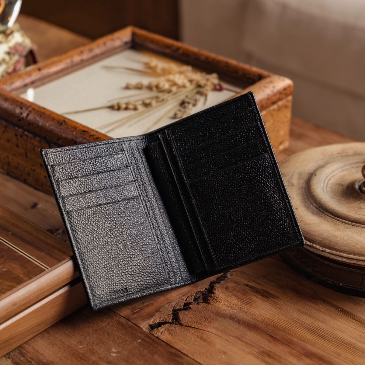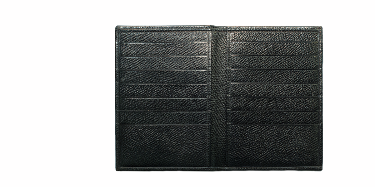 Cardinale exclusive Geneve collection wallet. 14 card slots, 1 note and passport compartment, 2 extra pockets. Material: grained calfskin. Colour: black. Dimensions: 10,5x 15. Made in Italy. Handcrafted from the same leather used for our shoes. An elegant men's wallet that has room for a lot of cards and for a passport.