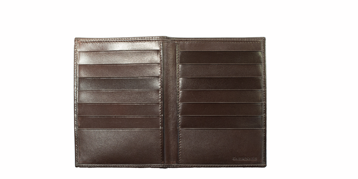 Cardinale exclusive Geneve collection wallet. 14 card slots, 1 note and passport compartment, 2 extra pockets. Material: full grain leather. Colour: dark brown. Dimensions: 10,5x 15. Made in Italy. Handcrafted from the same leather used for our shoes. An elegant men's wallet that has room for a lot of cards and for a passport.