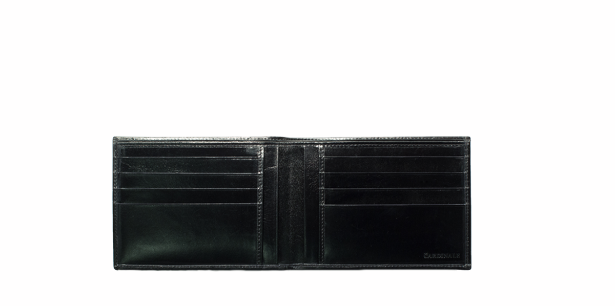 As part of the Cardinale Exclusive Royal collection, this wallet offers 8 card slots, 2 full-length note compartments, 4 extra pockets. Material: full grain calfskin. Colour: black. Dimensions: 12,5x 9,5. Made in Italy. It is made of the same leather used for our shoes. A great classic men's wallet.